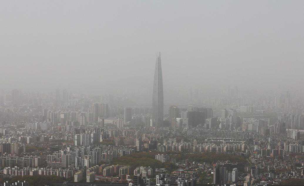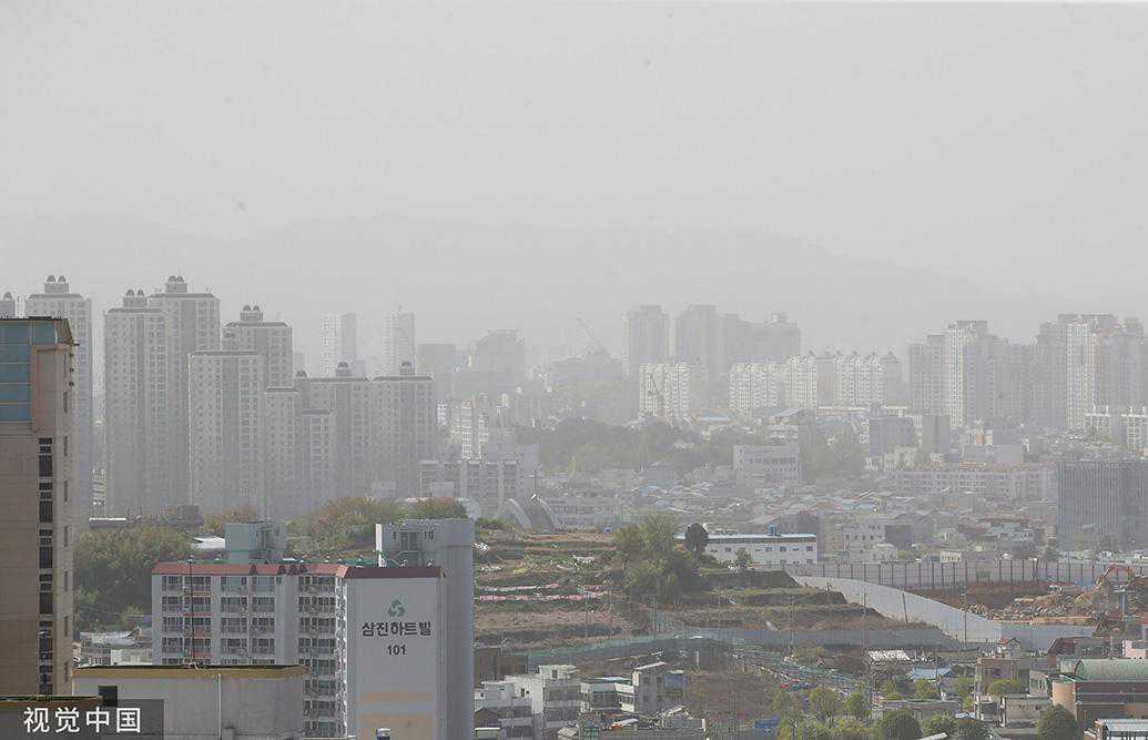 当地时间2023年4月12日,韩国首尔,建筑物被沙尘笼罩。