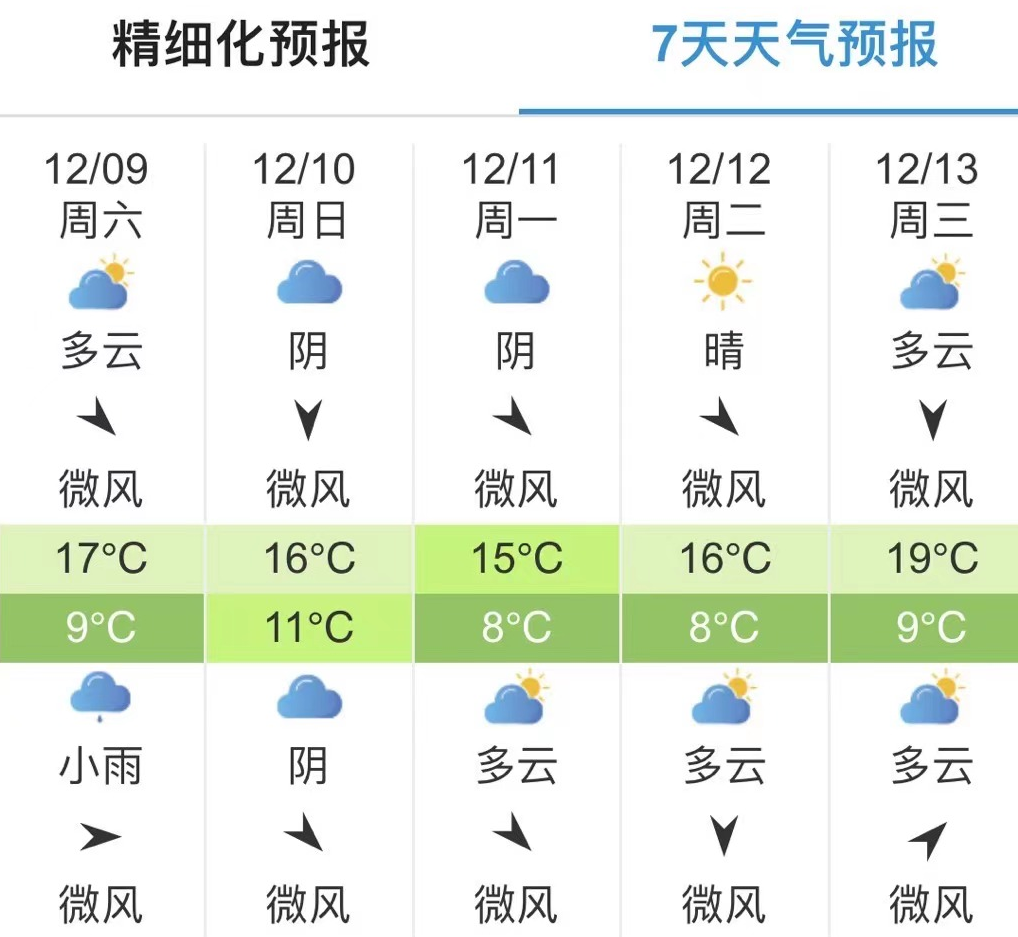 9日夜间到10日白天,各地小雨,气温7~16℃;中心城区小雨,气温13~16℃。