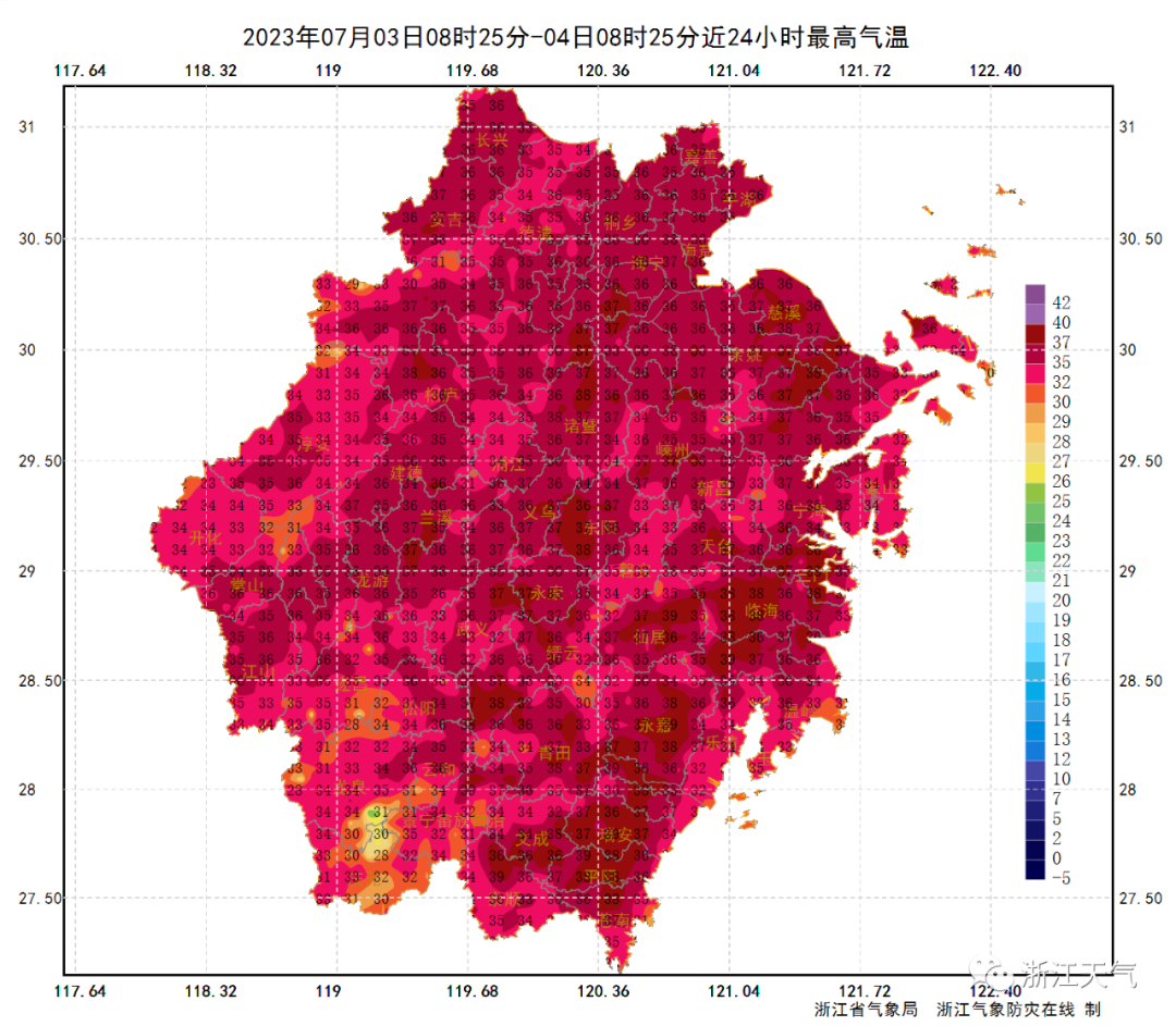 7月4日上午,浙江发布高温报告。下午1点,全国实时高温前十直接被浙江包揽!再加上相对湿度大,各地体感温度普遍超过40℃。