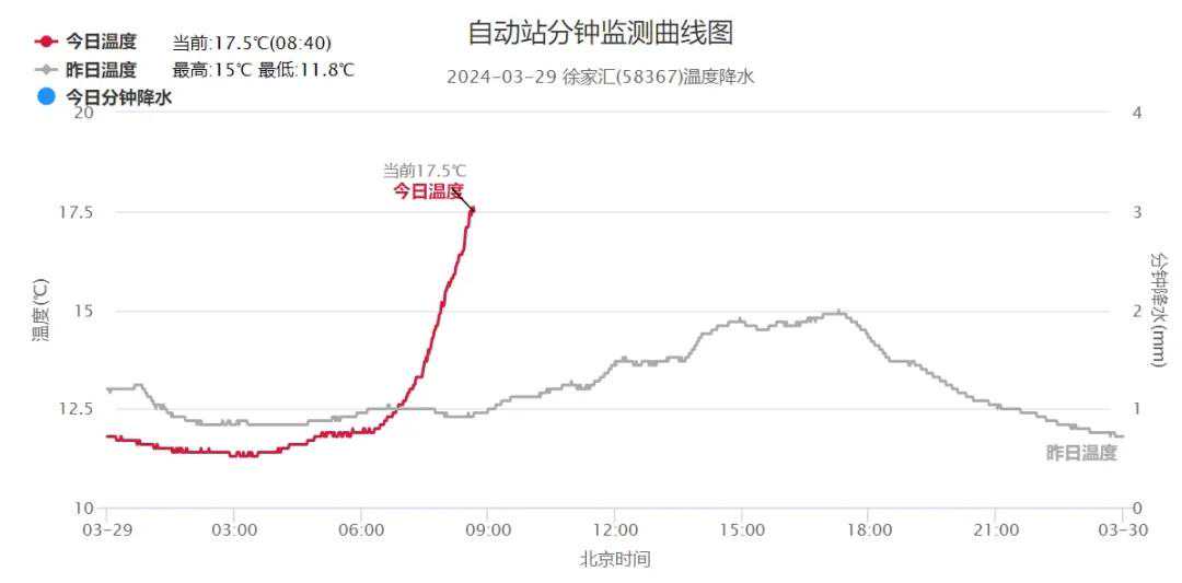 今日气温猛升。早晨6时,全市大部气温还在11℃附近,10时不到已超过20℃,活生生上演了一场“眼镜蛇超机动”。