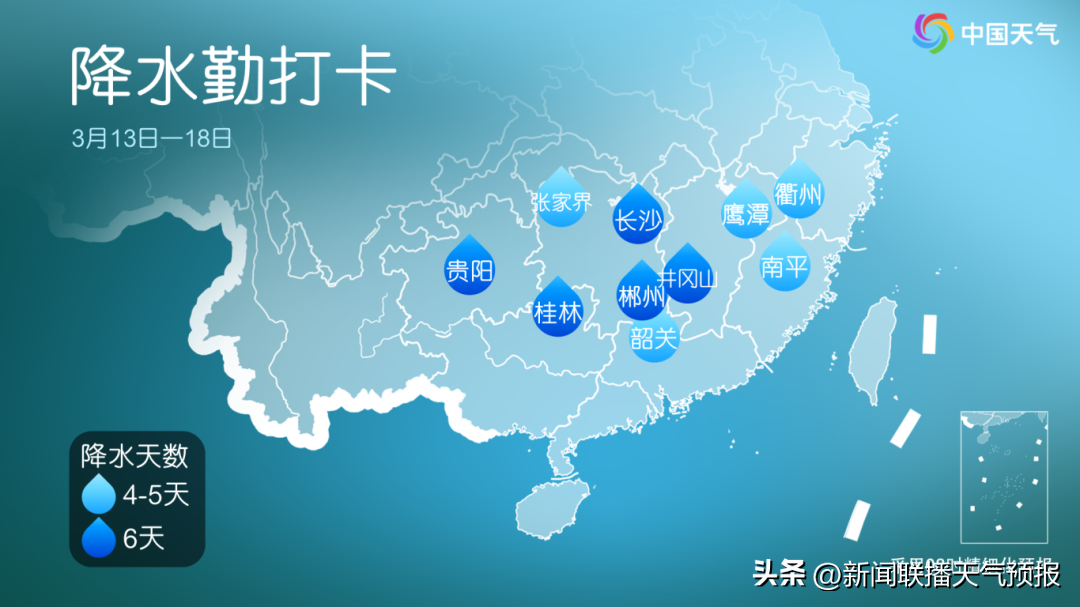 对于江南、华南北部等地来说,多雨的状态至少将维持到下周初。像是长沙、贵阳、桂林等城市未来6天都有雨。