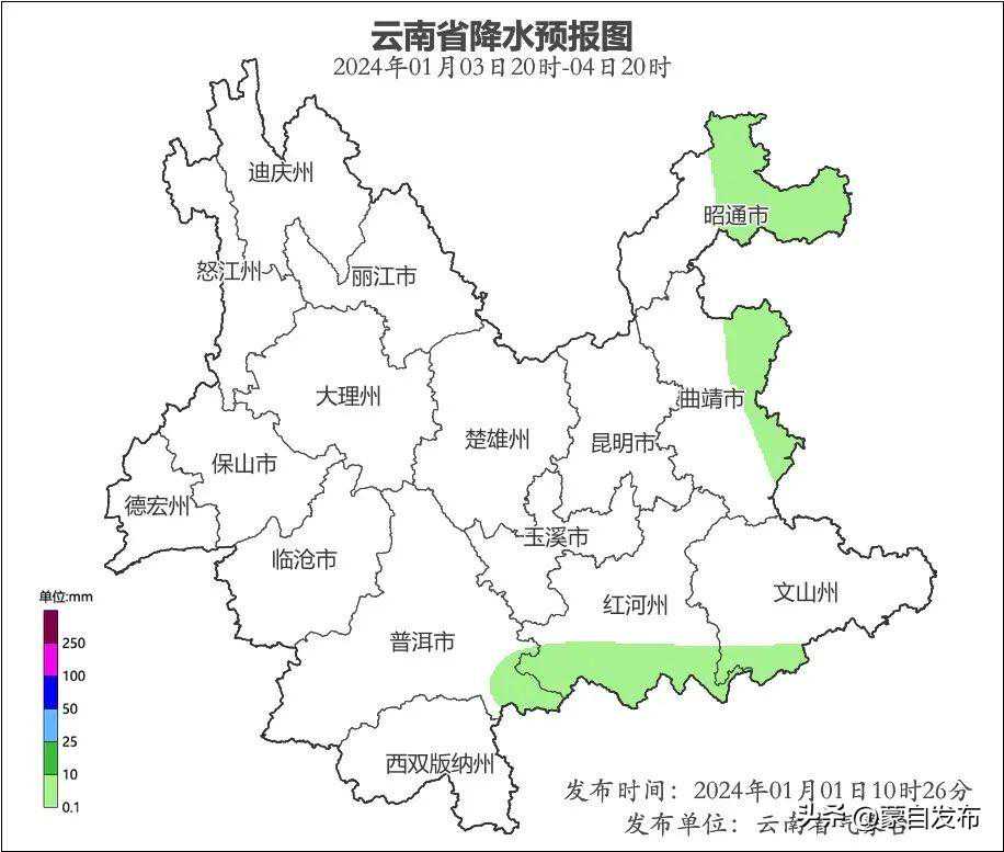 1月3日20时至1月4日20时:昭通市东部、曲靖市东部、文山州南部、红河州南部、普洱市东南部阴天间多云有小雨,其他地区多云。