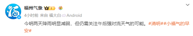 最新消息,鉴于降雨减弱,福州市气象台于4月5日9时15分解除暴雨预警Ⅲ级。