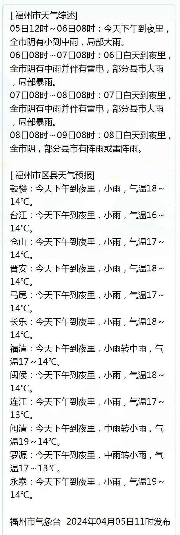 福州全市天气预报如下