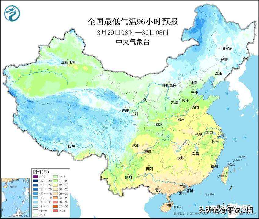 本月下旬的早些时候,新一轮寒潮携着冷空气南下,各地的气温出现了急速的降低,至本周末来临之前,寒潮影响我国趋于结束,各地的气温也有了迅猛的回升。从29日的最低气温预报图可以看到,我国中东部地区的最低气温有了快速的回升,气温普遍回升5℃~10℃,局地升温超12℃。