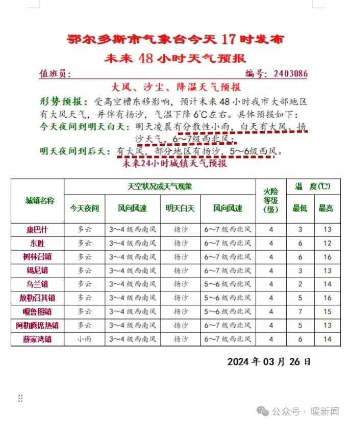 3月27日至28日,鄂尔多斯将出现大风、沙尘、降温天气。27日白天平均风力6级左右,阵风达8级以上,并伴有扬沙天气,局地有沙尘暴,西北部地区为大风沙尘灾害较高风险区。