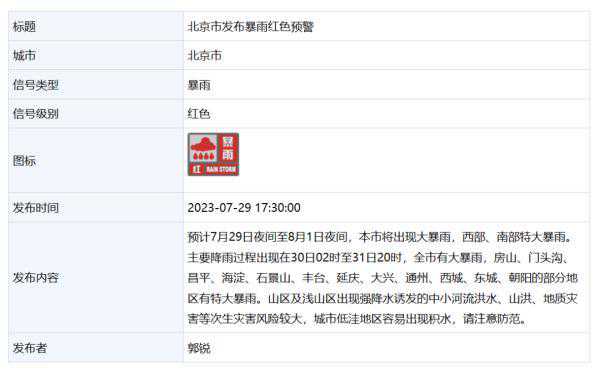 此外,北京市气象台7月29日17时30分升级发布最高级别的暴雨红色预警信号: