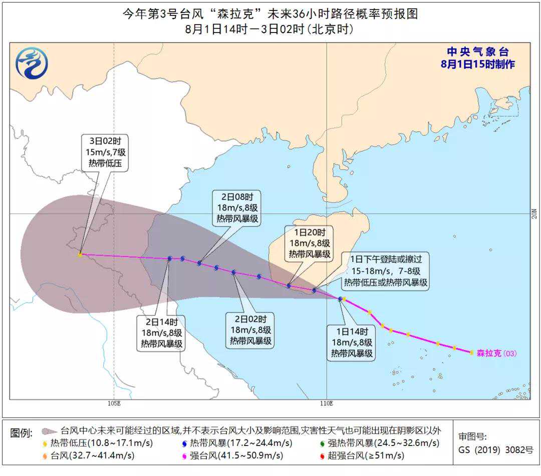 当天14时,“森拉克”中心位置北纬18.1度、东经110.3度,强度等级为热带风暴,最大风力8级,18米/秒(约65公里/小时),距离海南省三亚市偏东方向约85公里。预计“森拉克”将以每小时25公里左右的速度向西偏北方向移动。