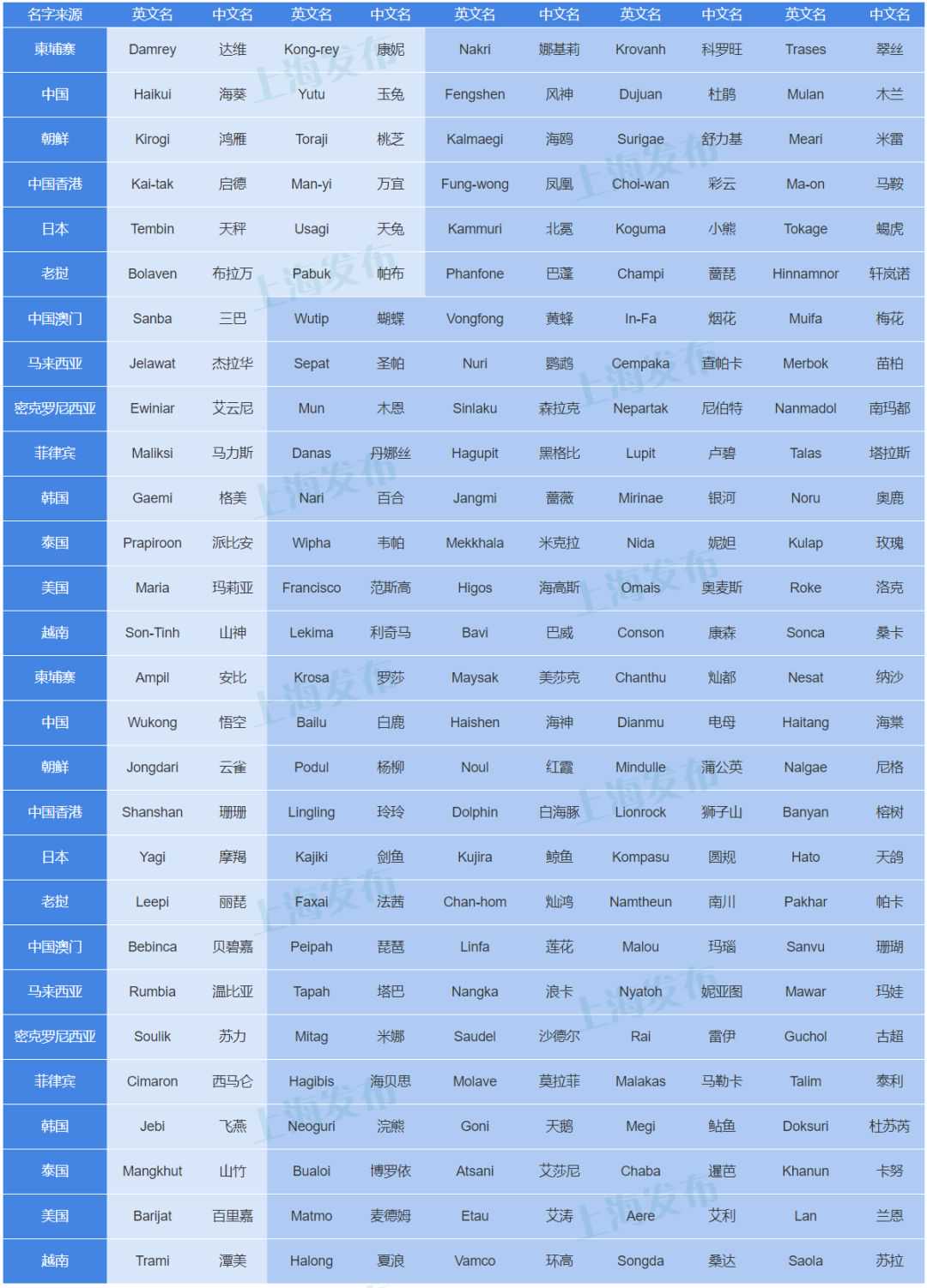 上海市气象局介绍,台风由14个国家和地区各选10个名字循环使用,部分造成恶劣灾害的台风还有可能被除名。目前,中国大陆提供的10个名字分别是海葵、玉兔、风神、杜鹃、木兰、悟空、白鹿、海神、电母、海棠。其中,“木兰”取代了被除名的“海马”,“白鹿”取代了被除名的“海燕”。
