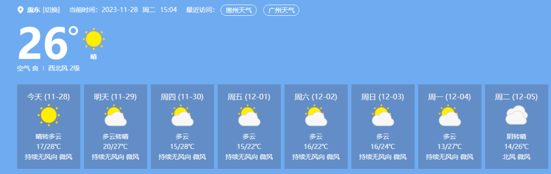 周二至周三,惠州市各地以晴间多云天气为主,16~26℃;