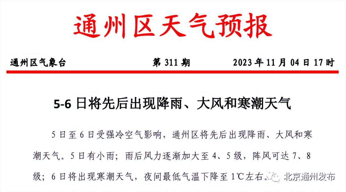 5日(周日)至6日,受强冷空气影响,通州区将先后出现降雨、大风和寒潮天气。