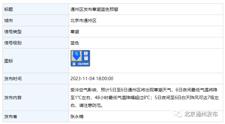 通州气象台发布寒潮蓝色预警
