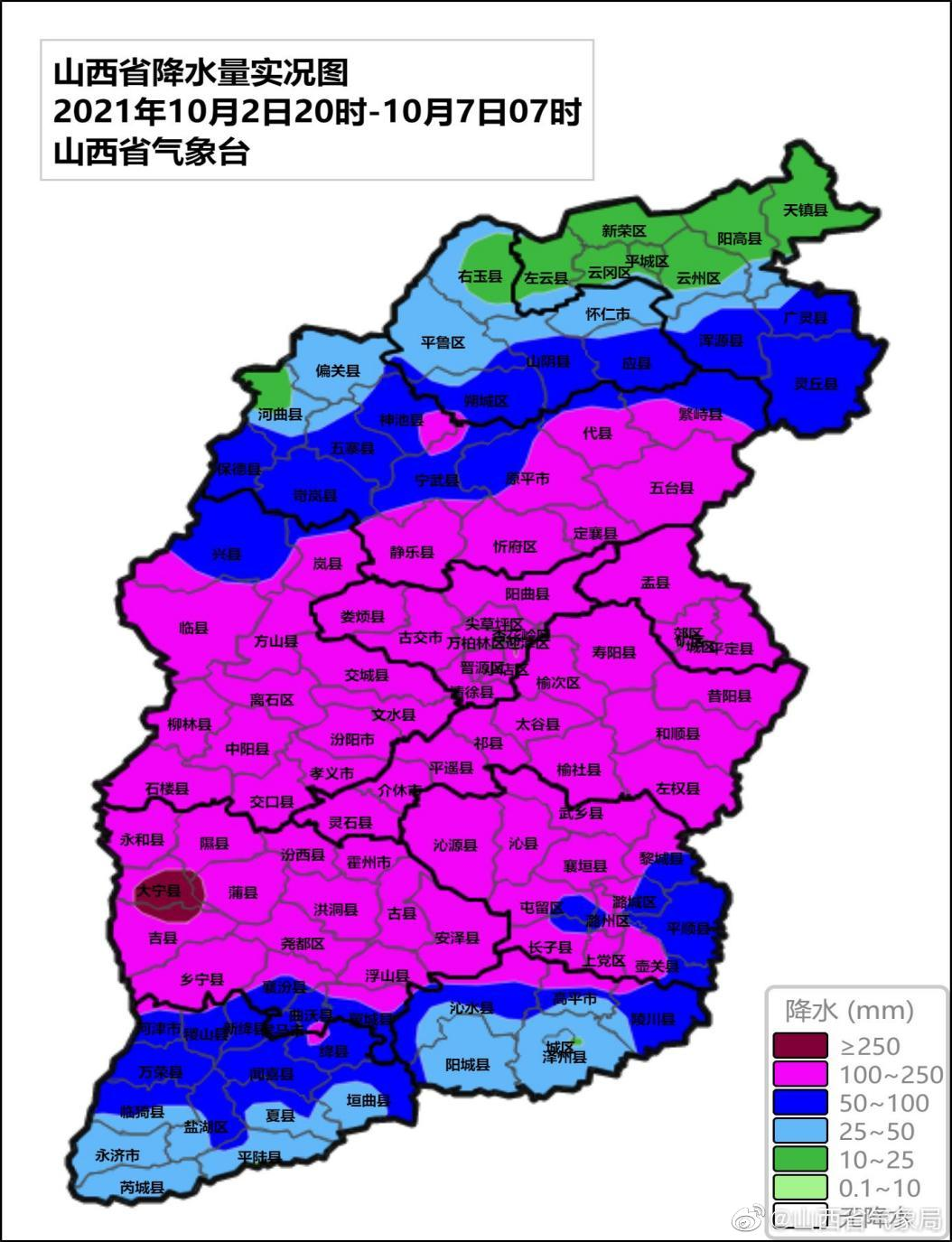 从10月2日20时,到10月7日08时,山西全省平均降雨量达到了119.5毫米,全省有18个县(市、区)降水超过200毫米,累计降水量最大为285.2毫米。是常年同期的5倍以上,其中太原附近的降水量达到了往年同期的8倍以上。