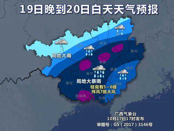 预计,受台风“三巴”和冷空气共同影响,10月19日至22日,玉林市将有一次强降雨天气过程,累计平均降雨量100~150毫米,最大累计降雨量250毫米以上。最强降雨时段可能出现在19日晚上至20日白天,最大小时雨强40~60毫米。具体预报如下: