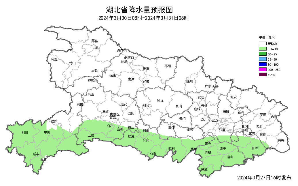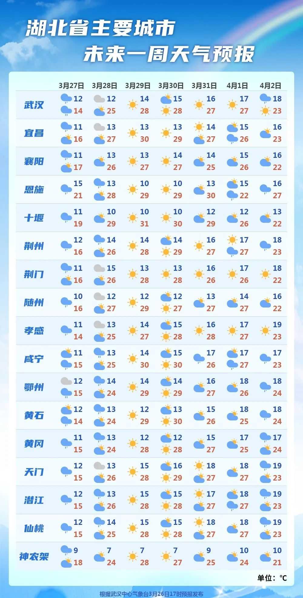 30日08时-31日08时,鄂西南、江汉平原南部、鄂东南多云,夜间转阵雨;其他地区晴天到多云。最高气温26~30℃,最低气温西部11~15℃、中东部15~18℃,偏南风转偏北风2到3级。