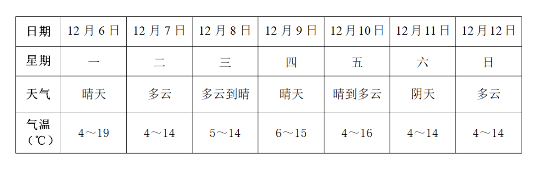 今明两天全市多云,最低气温3-5℃,最高气温13-15℃;后天多云到晴。受冷空气影响,后期开始有一次大风、降温天气,偏北风3-4级,阵风6-7级,冷空气过后,气温有所下降,明天最高气温降至12-14℃;8日后以多云到晴为主,气温起伏不大,最低气温4-6℃,最高气温13-16℃;11日还有一次冷空气影响我市。