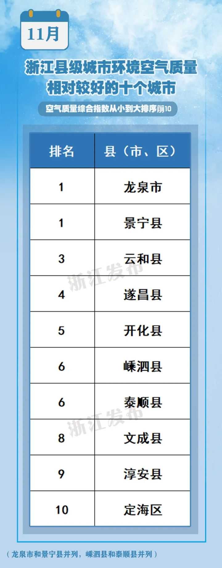 168个重点城市空气质量排名前20位中浙江占4席,分别是舟山市、丽水市、台州市、宁波市。