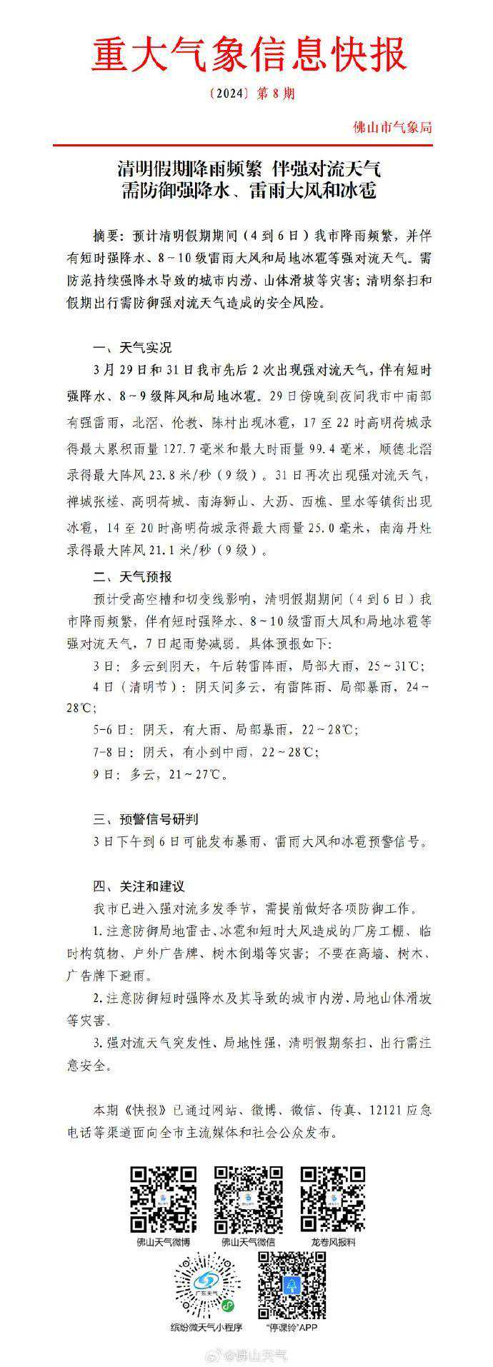 注意:本次降雨过程持续时间长、累积雨量大,对粤北山区致灾性强,需注意防御强降水导致的河谷水位上涨、突发性山洪以及泥石流、滑坡等地质灾害和城乡积涝,并注意防御雷电、短时大风、冰雹等强对流天气对假期出行、清明祭扫造成的安全风险。