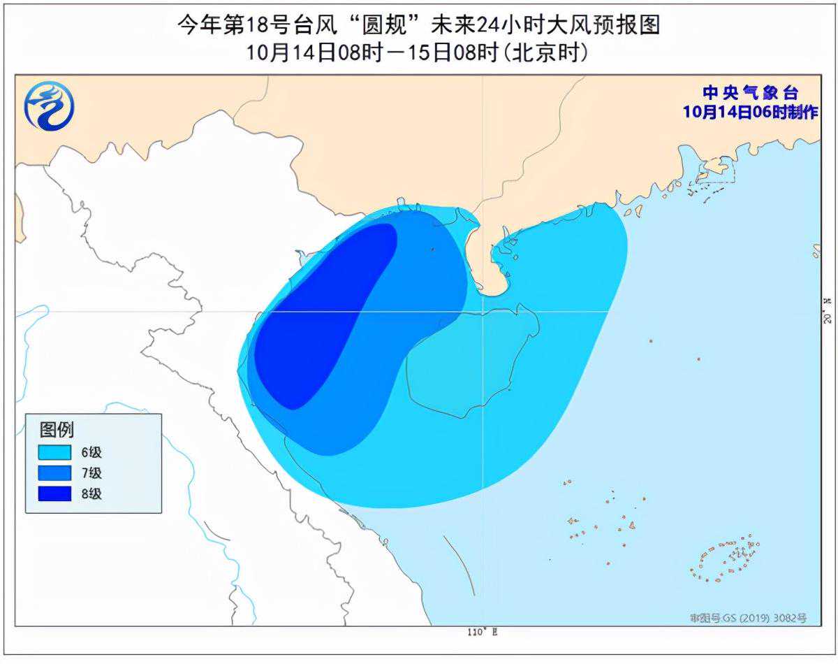 大风预报:14日08时至15日08时,受“圆规”和冷空气的共同影响,南海西北部、北部湾、琼州海峡,以及广东西部沿海、广西沿海和海南沿海将有6-8级、阵风9-10级的大风。