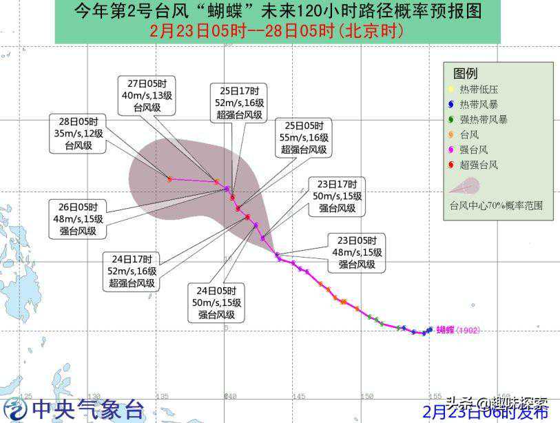2月23日最新卫星数据显示,强台风“蝴蝶”正以15公里的速度向北偏西方向移动,距离美国关岛约为345公里,具体坐标为北纬10.5度和东经143.8度。从当前移动方向来看,这个台风正对准日本。不过,一般来说台风较容易受到气流影响,移动路径是“多愁善变”,一会左,一会右。