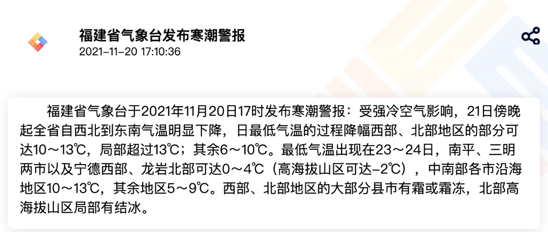 福建省气象台于2021年11月20日17时发布寒潮警报受强冷空气影响,21日傍晚起全省自西北到东南气温明显下降,日最低气温的过程降幅西部、北部地区的部分可达10~13℃,局部超过13℃;其余6~10℃。最低气温出现在23~24日,南平、三明两市以及宁德西部、龙岩北部可达0~4℃(高海拔山区可达-2℃),中南部各市沿海地区10~13℃,其余地区5~9℃。西部、北部地区的大部分县市有霜或霜冻,北部高海拔山区局部有结冰。