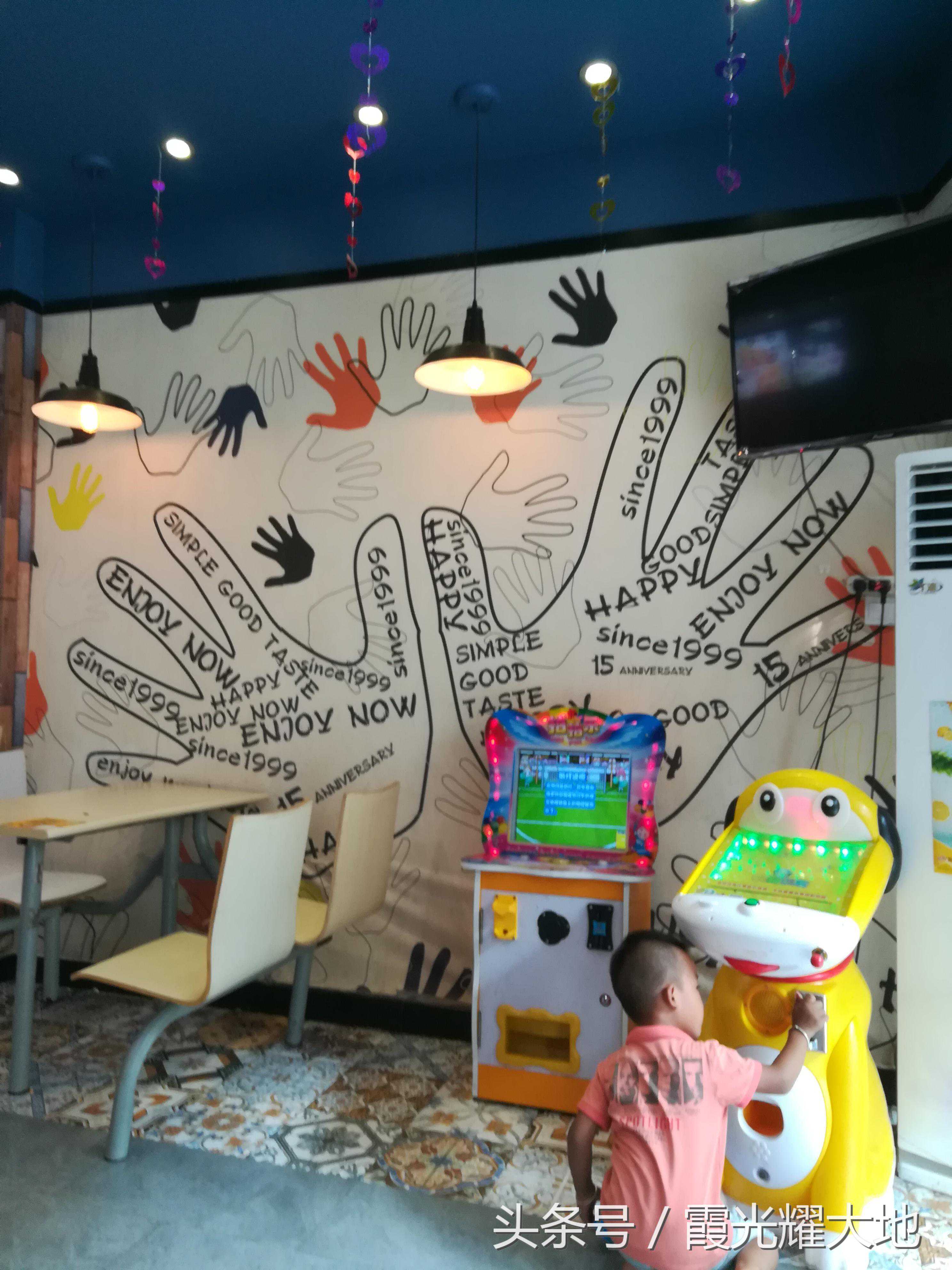 店旁一角落摆放了两个游戏机,大概为了吸引人气,一小男孩正在玩游戏机。