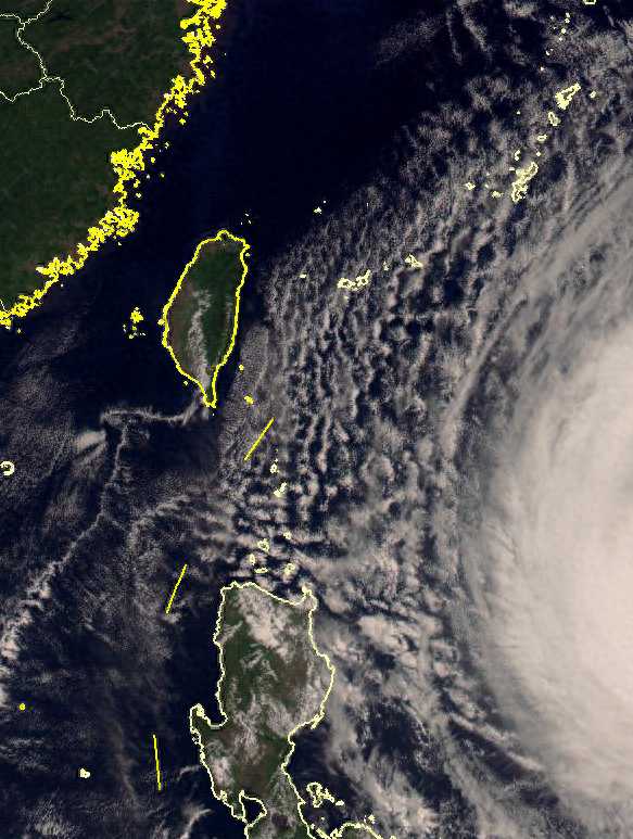 在台风玉兔的边缘出现了很多奇怪的云系,这实际上是干而冷的气团在暖的海洋和台风边缘形成的云系,这是秋冬季台风常见的一种现象。