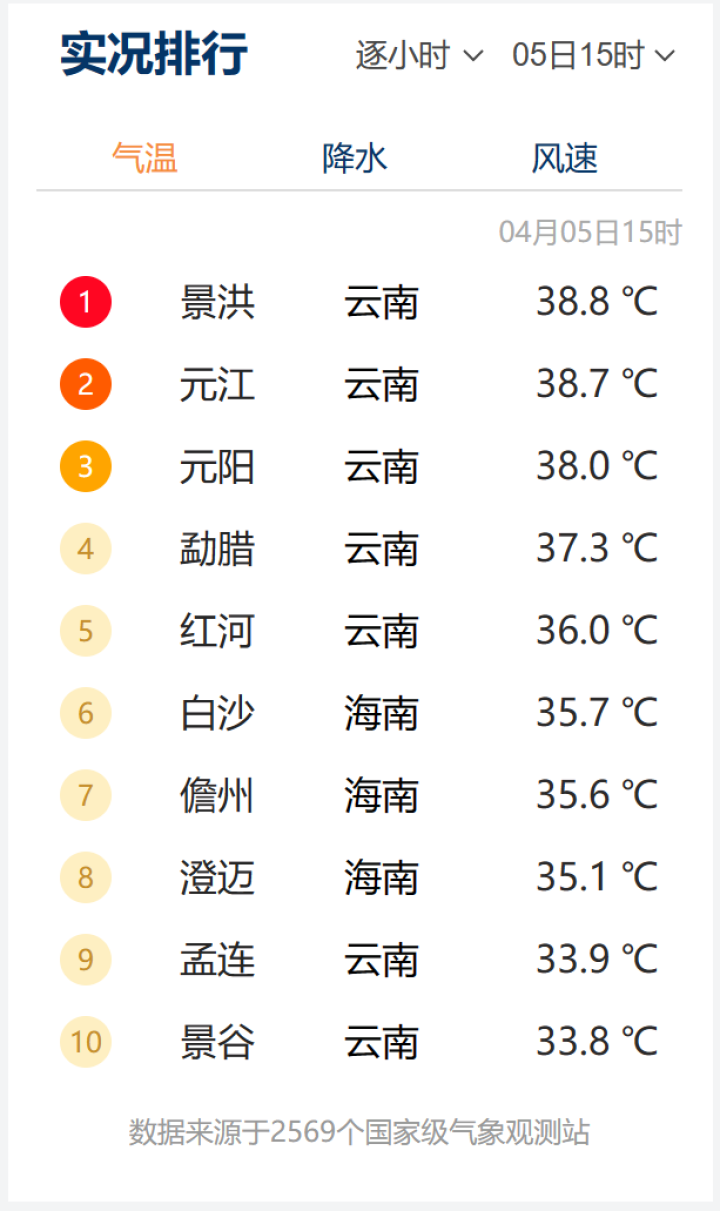 中国天气网最高气温实况排行榜显示