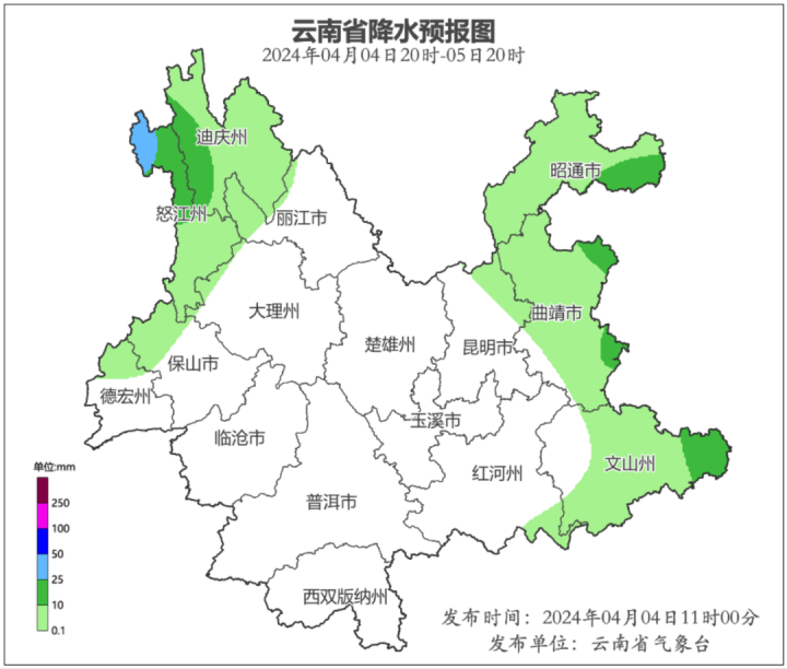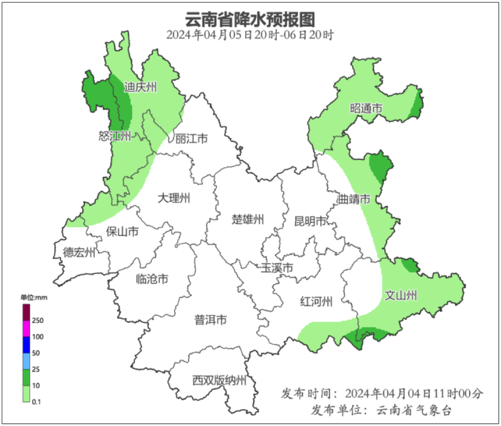 4月4日20时到4月5日20时:迪庆州北部阴有雨夹雪,迪庆州西南部、怒江州北部多云有中雨局部大雨,迪庆州东南部、怒江州南部、保山市北部、德宏州北部、昭通市、曲靖市北部和东南部、文山州东部和南部、红河州东南部多云有阵雨局部中雨,其他地区晴间多云。