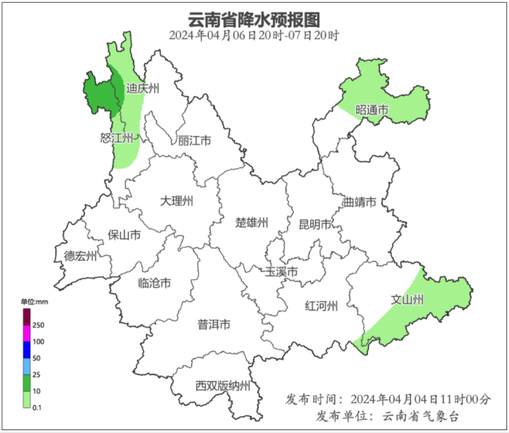 4月6日20时到4月7日20时:迪庆州北部阴有雨夹雪,怒江州北部多云有小到中雨,迪庆州西部、怒江州南部、昭通市北部、文山州南部、多云有阵雨,其他地区晴间多云。