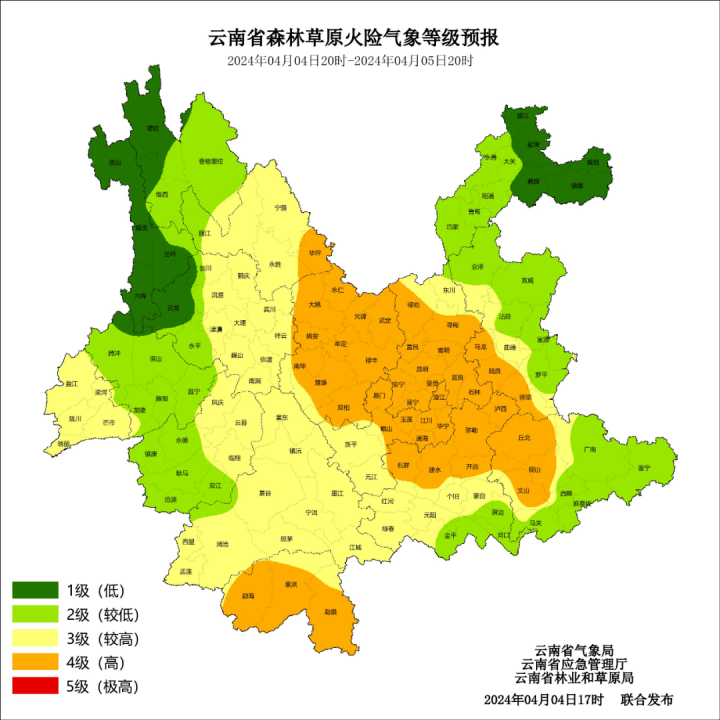 预计4月4日20时—4月5日20时,丽江市东部、楚雄州、昆明市、玉溪市东部、曲靖市西部、红河州北部、文山州西部、西双版纳州4级,丽江市中部、大理州东部、德宏州、临沧市东部、普洱市、玉溪市西部、红河州中部、文山州中部、曲靖市中部3级,其他地区1~2级。