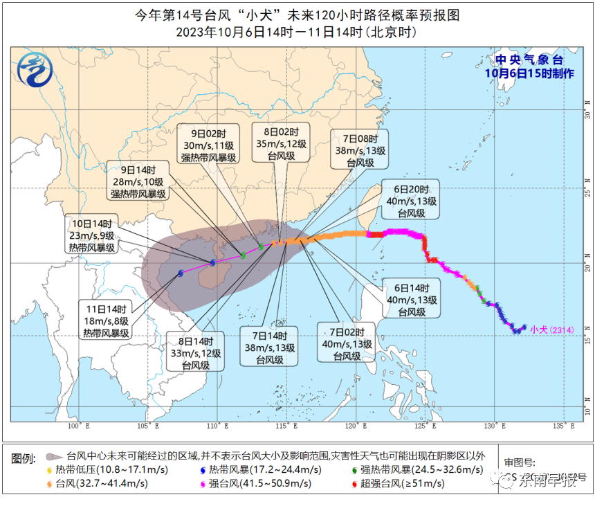 预计,“小犬”将以每小时5-10公里的速度向偏西方向移动,逐渐向广东东部沿海靠近,强度维持或缓慢减弱,8日在广东东部近海海面转向西偏南方向移动,强度逐渐减弱。