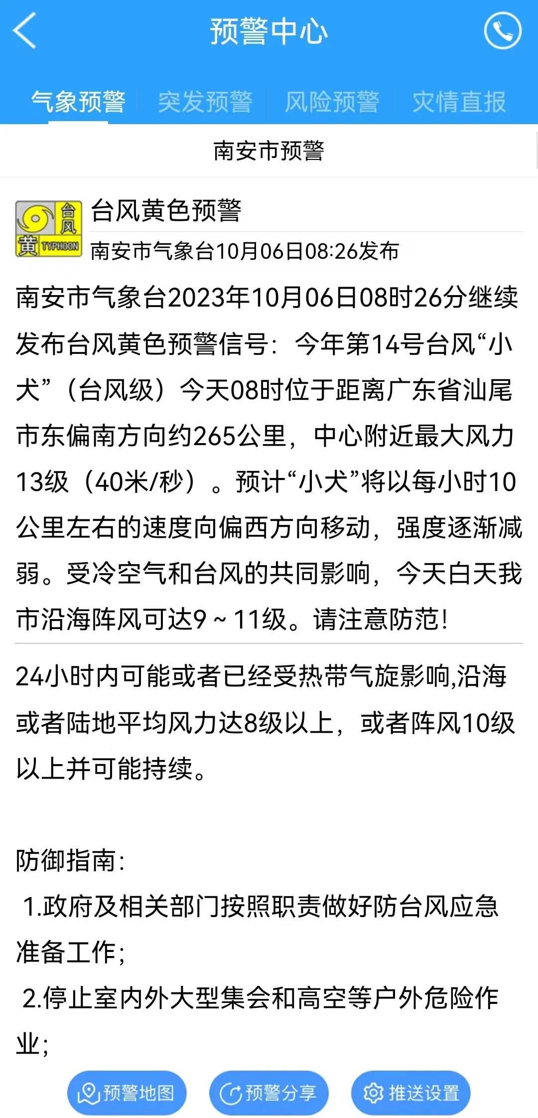 ●预计“小犬”将以每小时10公里左右的速度向偏西方向移动,强度逐渐减弱。受冷空气和台风的共同影响,今天白天南安沿海阵风可达9~11级。请注意防范!